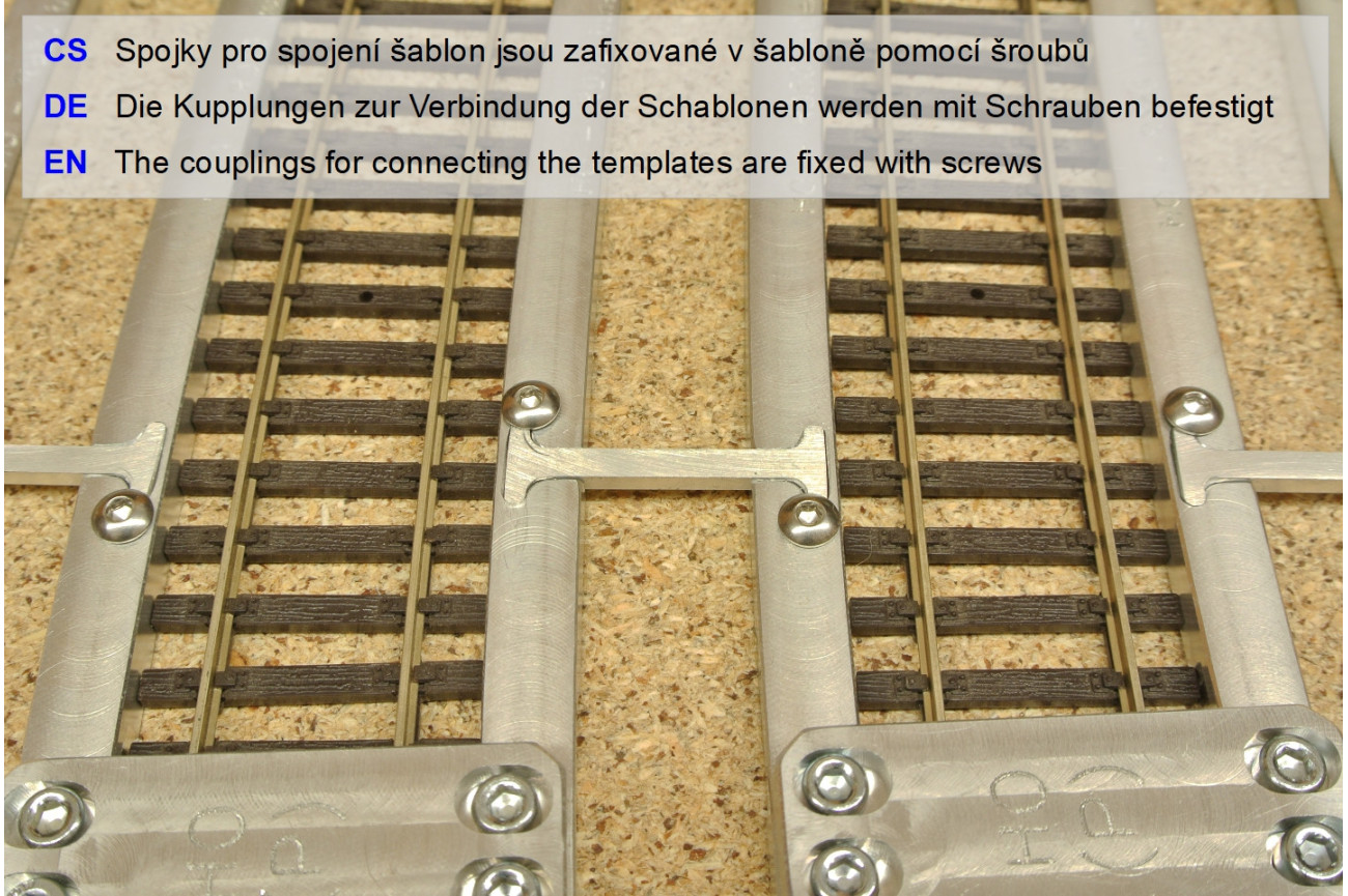 All types of track laying templates are now equipped with connectors secured with locking screws as of 10/2023. This solution is simpler and more reliable; it is no longer necessary to press the connectors into the templates. Simply insert the connector and secure it with a screw. Compatibility with the original connectors has been maintained.